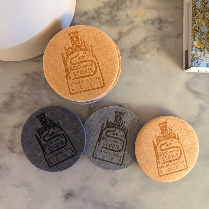 Featuring our 2025 Anniversary logo, these pressed felt coasters are super-absorbent, soft on your furniture, lightweight, and long-lasting. They are the perfect size to sit under a wine bottle to catch drips and condensation, but can also be used for regular drinkware, of course!